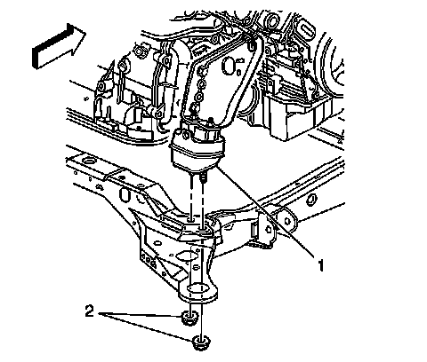12. Install the fasteners (2) retaining the front right transaxle mount (1) to the engine frame. Refer to Automatic Transmission Mount Replacement - Right Side in Automatic Transaxle - 4T80-E.