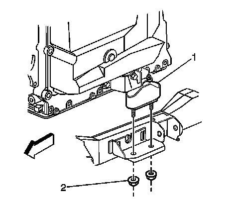 18. Remove the fasteners (2) retaining the right transaxle mount (1) to the engine frame. Refer to Automatic Transmission Mount Replacement - Right Side in Automatic Transaxle - 4T80-E.