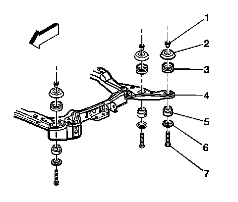 3. Assemble the engine frame insulators, in sequence, to the engine frame (4). Refer to Frame Cushion or Insulator Replacement (Service and Repair).