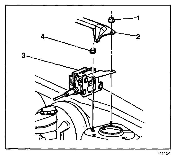 4. Remove the nut (4) securing the cruise control mounting bracket to the left strut tower.