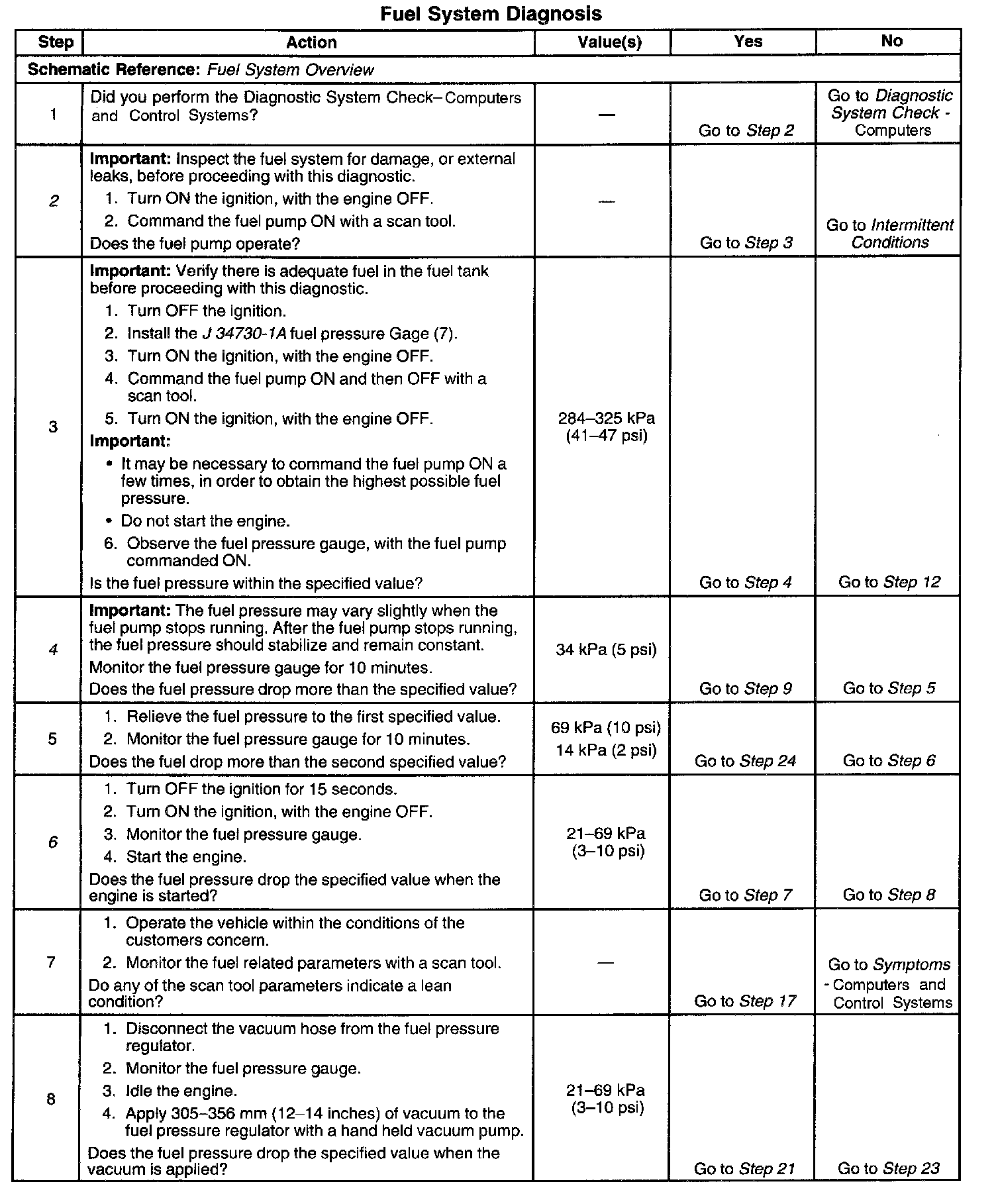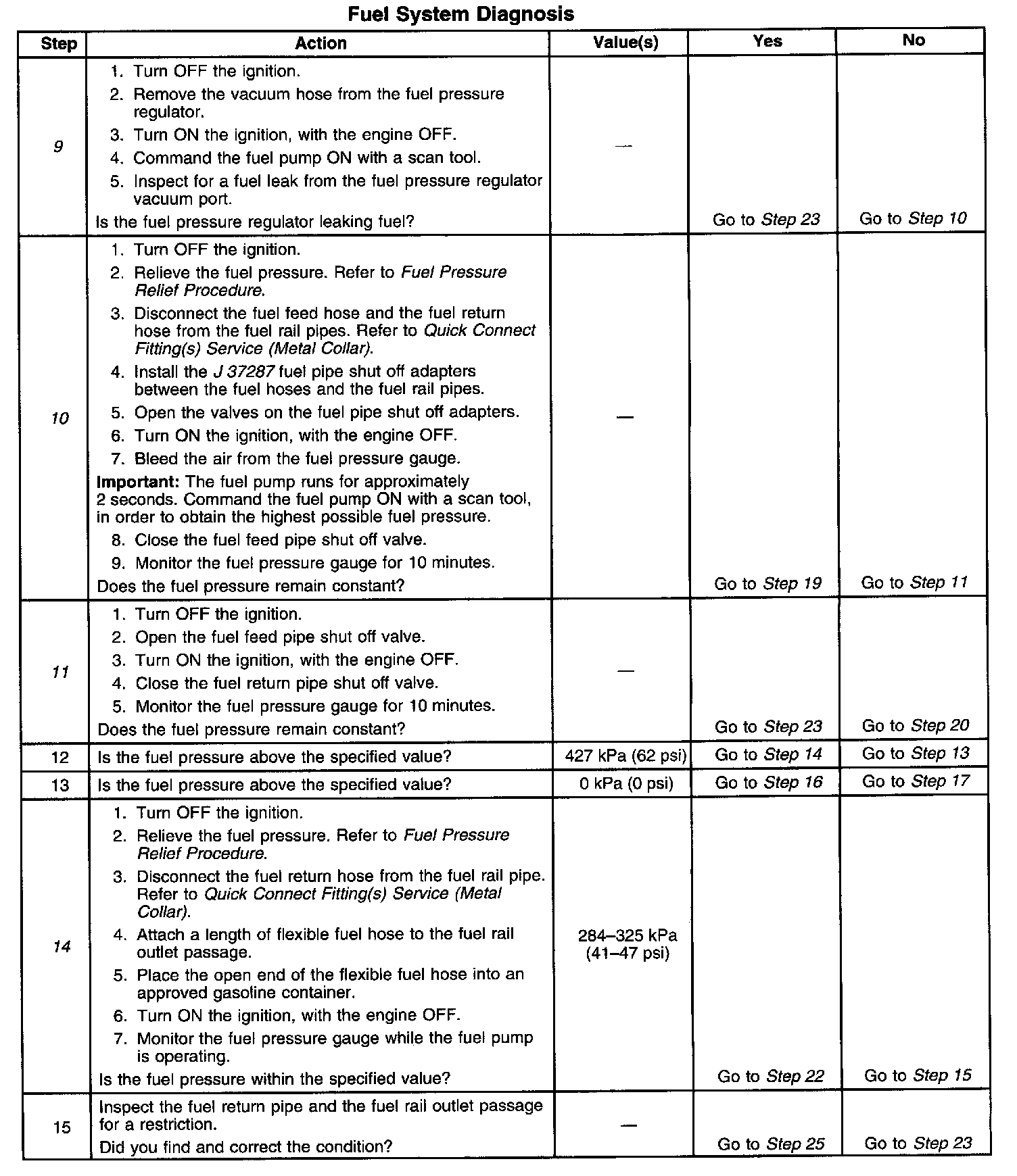 14. This step tests for a restricted fuel return pipe. If the fuel pressure is within the specified values, a restriction in the fuel return pipe is indicated.