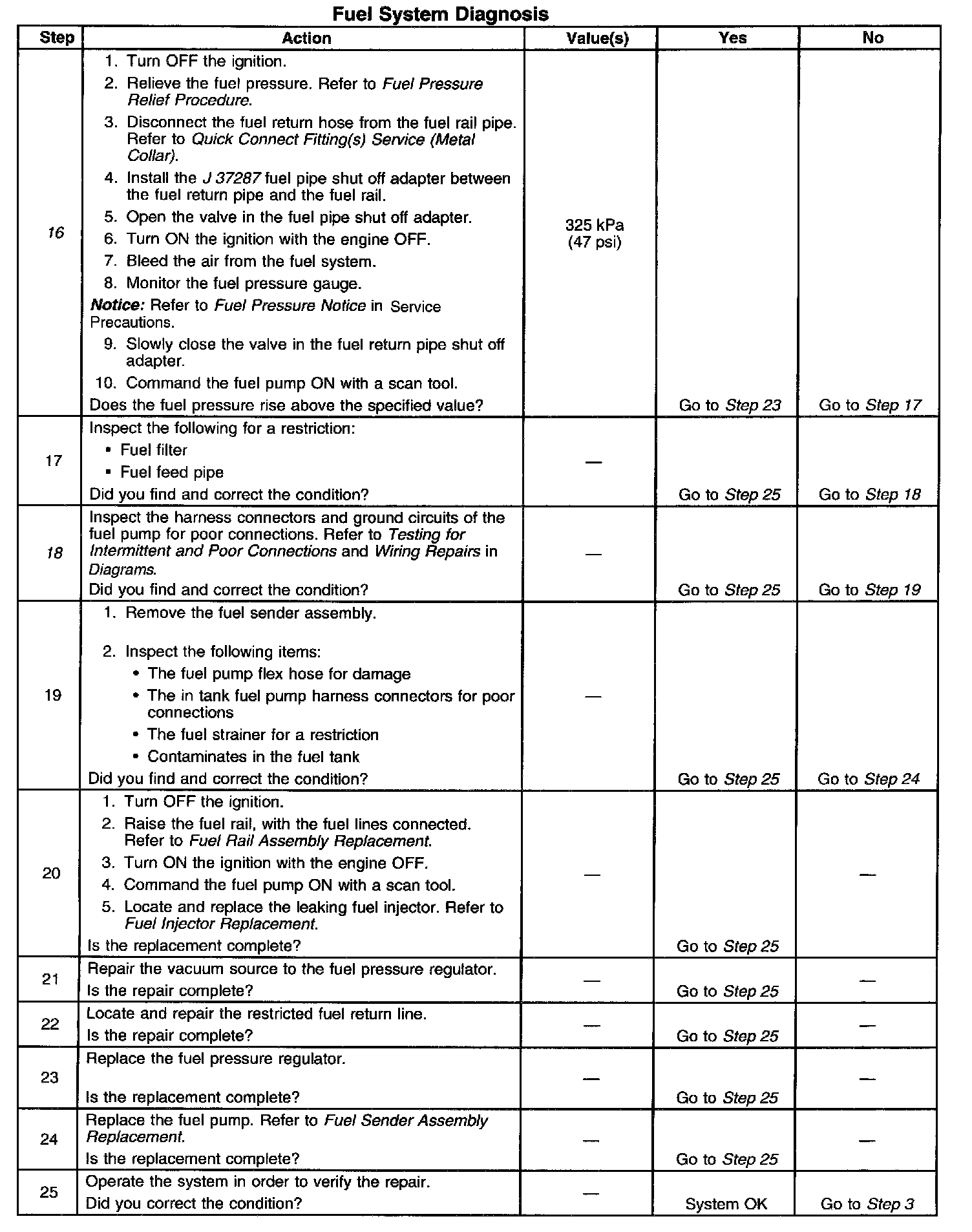 18. This step verifies that a circuit condition is not the cause of a fuel pressure concern. Inspect all fuel pump electrical circuits thoroughly.
