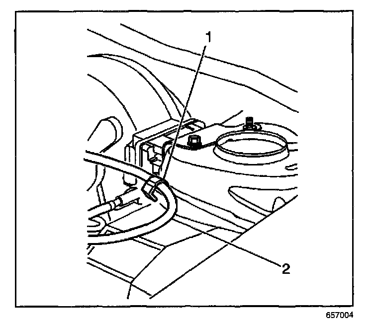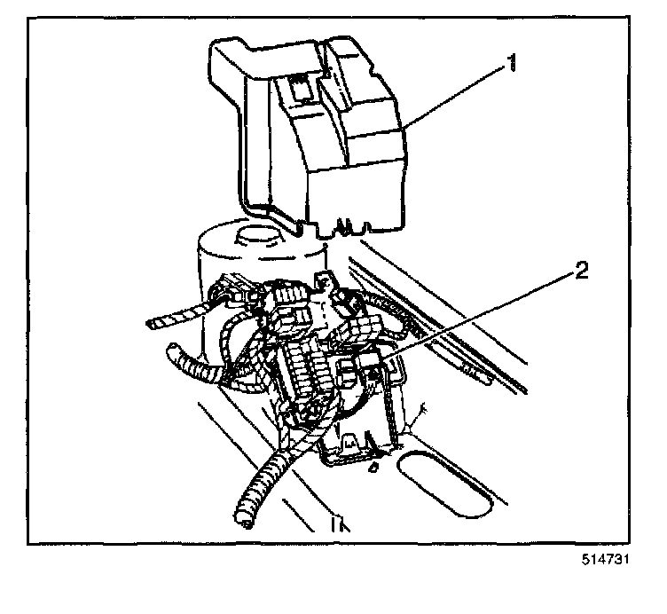 14. Secure the cruise control cable (2) to the retention clip (1) located on the left strut tower.