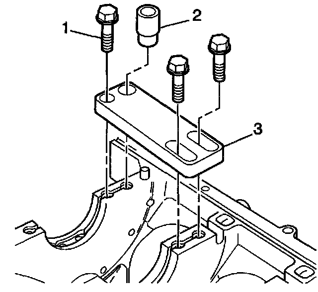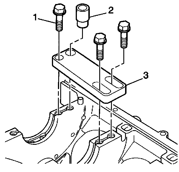 1. Position the fixture plate (3) with the bushing (2), installed over the crankshaft main cap bolt hole to be repaired.