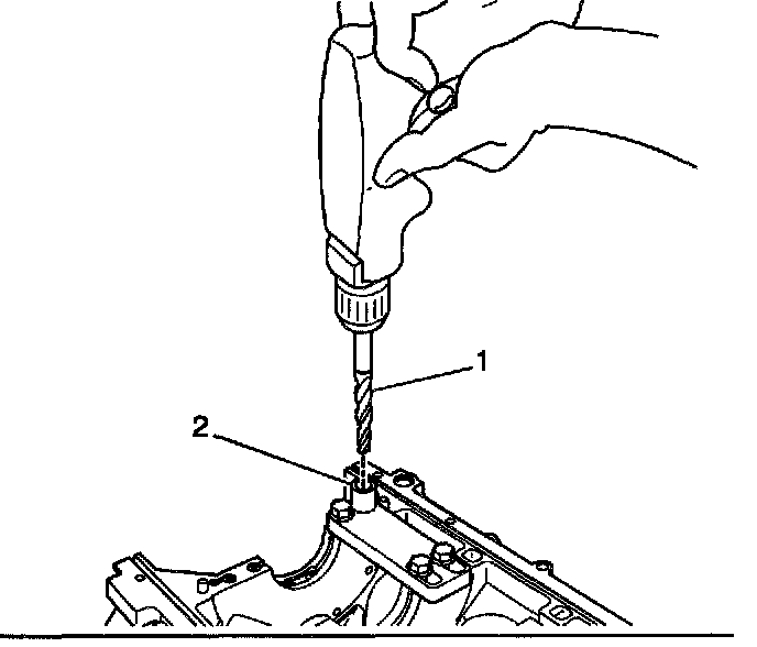 ^ Drill the crankshaft main bolt hole until the mark (1) on the drill aligns with the top of the drill bushing (2).