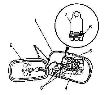 1. Remove the standard mirror glass assembly (2) from the housing (1) of the outside rear view mirror assembly.
