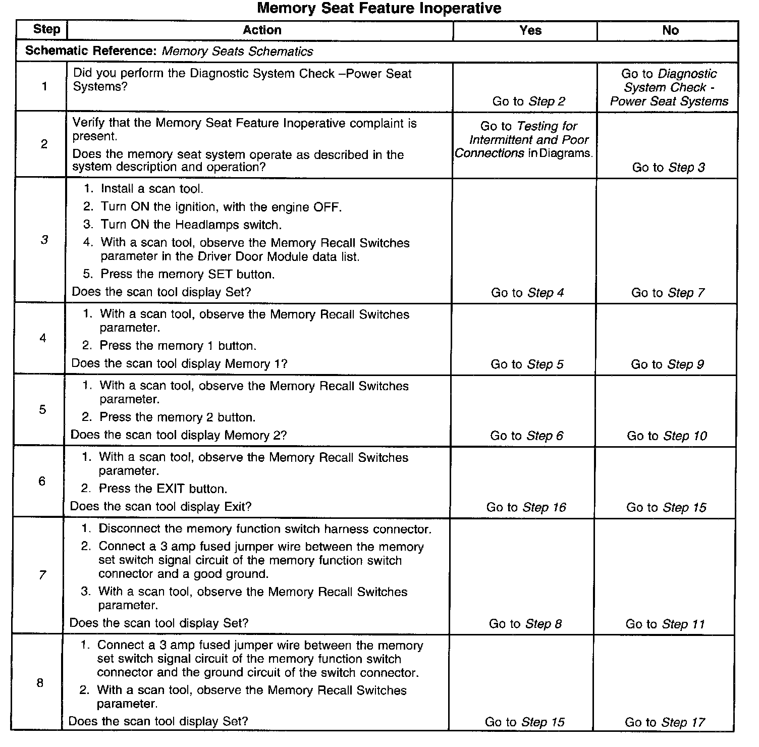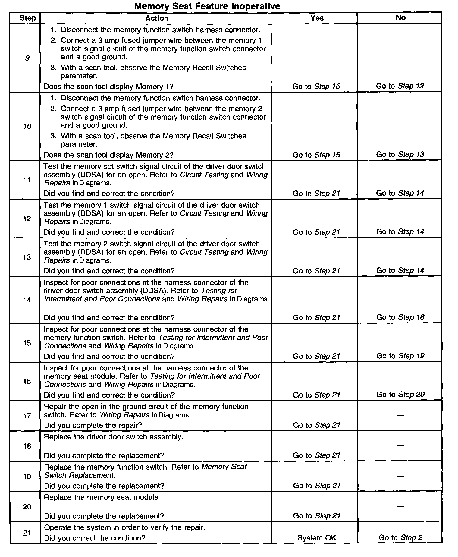 10. This step tests the integrity of the memory 2 switch signal circuit of the driver door switch assembly. If the fuse in the jumper wire opens when you perform this test, a short to battery voltage may have occurred.