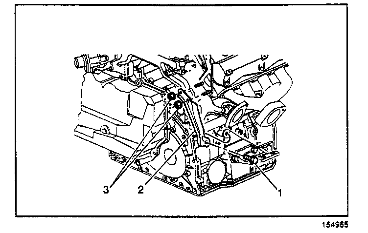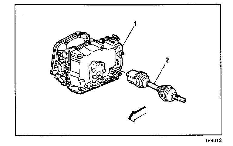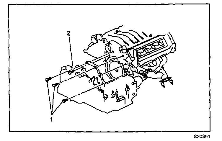 6. Align the transaxle with the engine and position the transaxle onto the engine dowels. Install the engine to transaxle bolt (2).