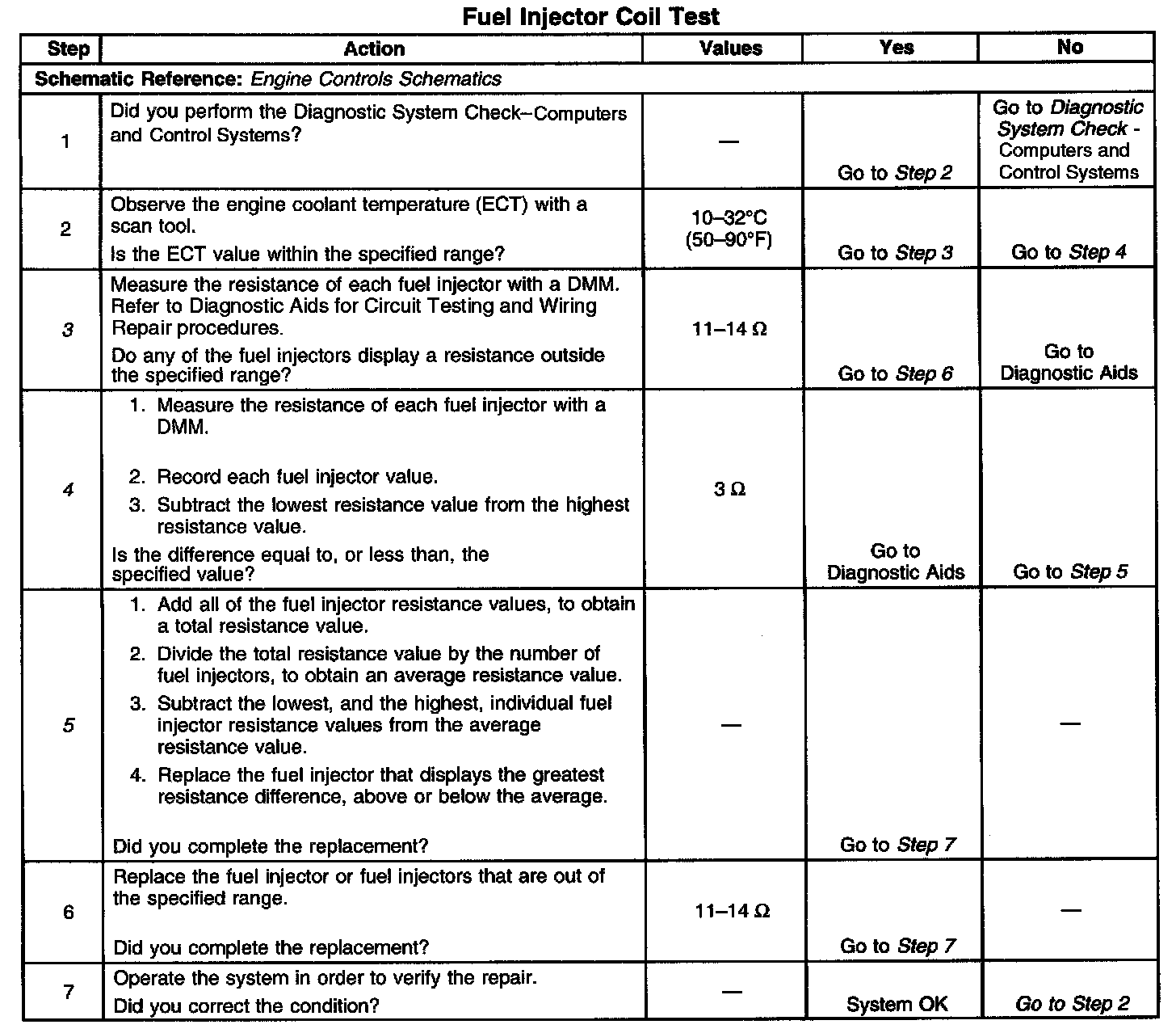 ^ Perform the fuel injector coil test within the conditions of the customers concern. A fuel injector condition may only be apparent at a certain temperature, or under certain conditions.