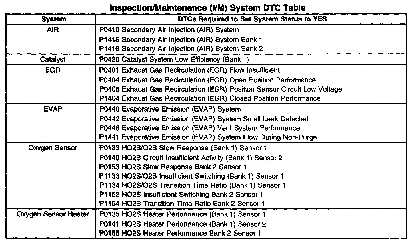 I/M System DTC Table