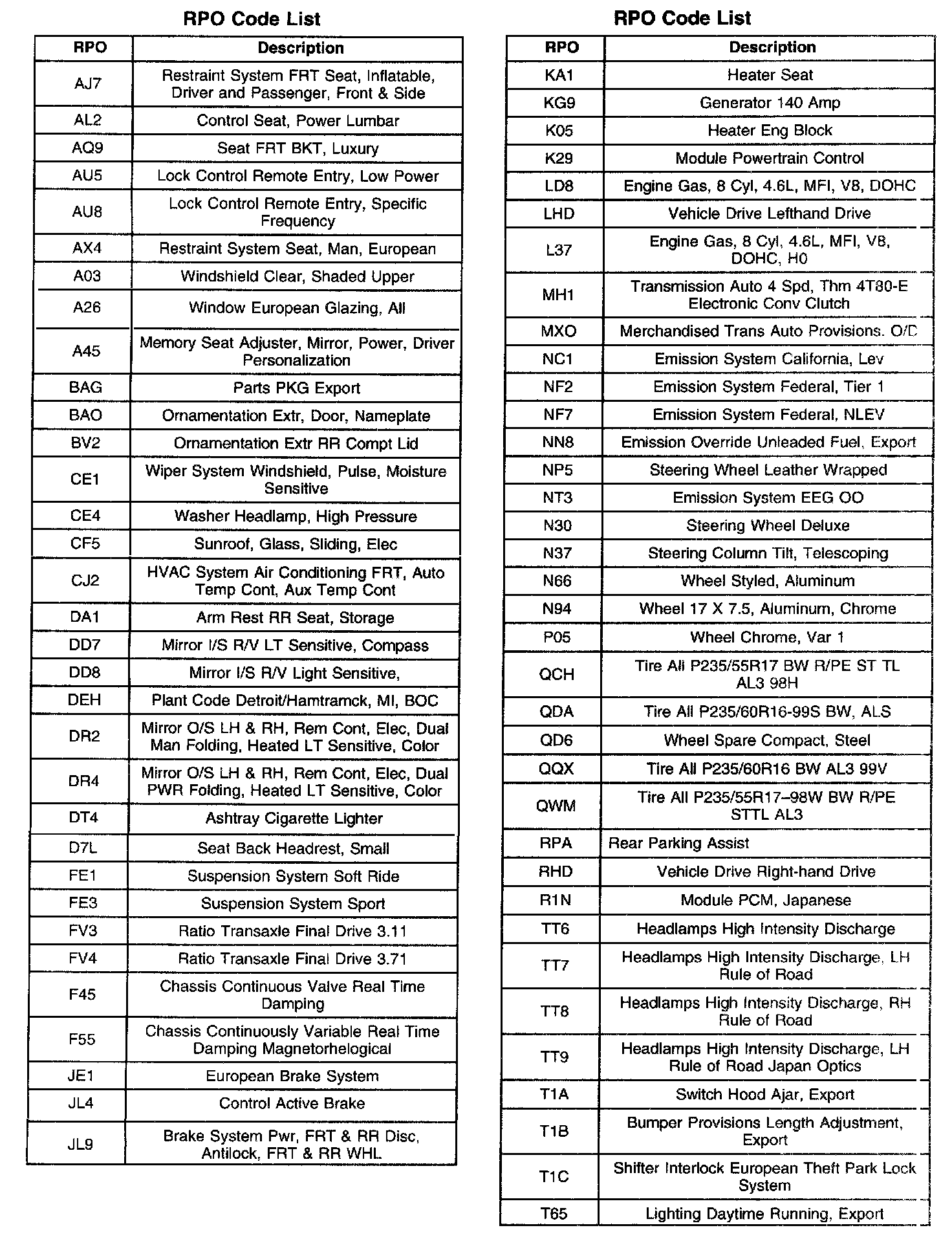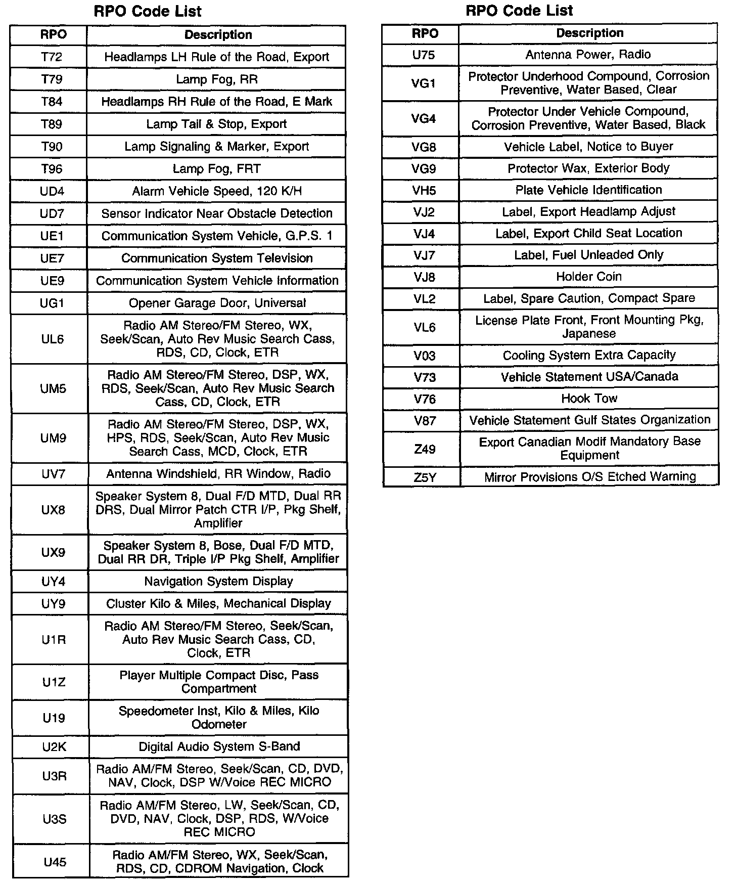 RPO Code List Part 1: