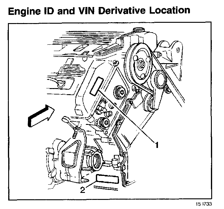 The engine ID number will be located on the end surface of the cam cover (1), and the VIN derivative is located on the engine block in front of the transaxle extension (2), as shown.