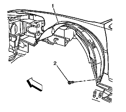 2. Remove the fasteners (2) securing the front wheelhouse panel (1) to the rocker panel molding.