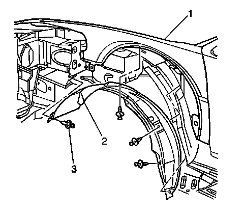 2. Install the push in retainers (3) in order to secure the front wheelhouse liner (2) to the vehicle.