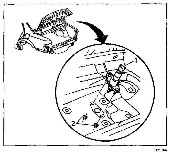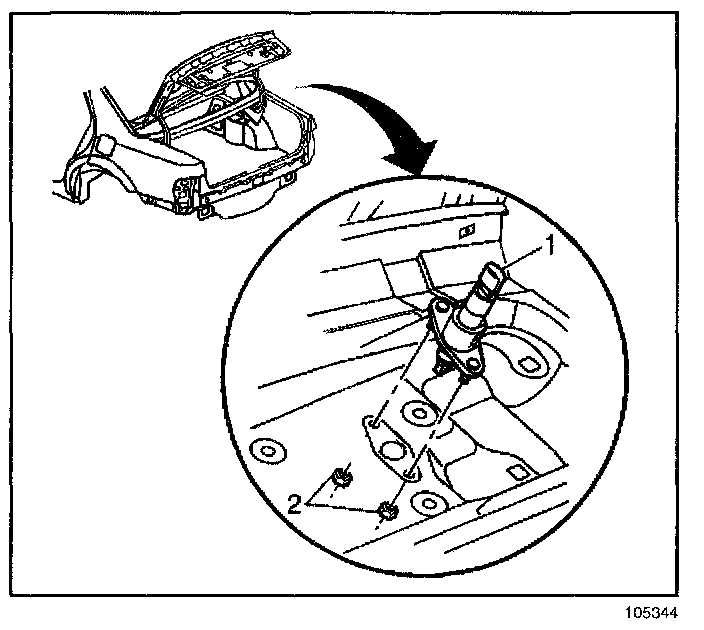 4. Remove the fasteners (2) securing the lid lock cylinder (1) to the rear compartment lid.