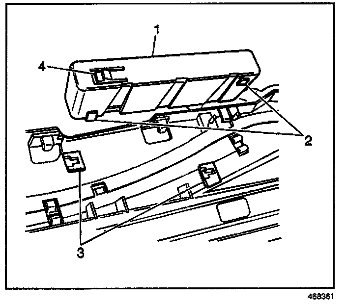 2. Install the sunroof express module tabs (2) into the sunroof module slots (3) located on the sunroof module.