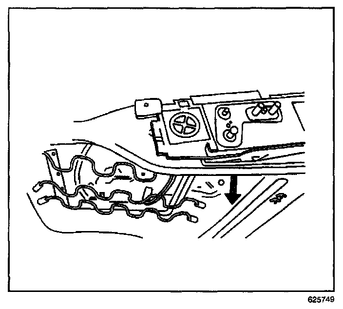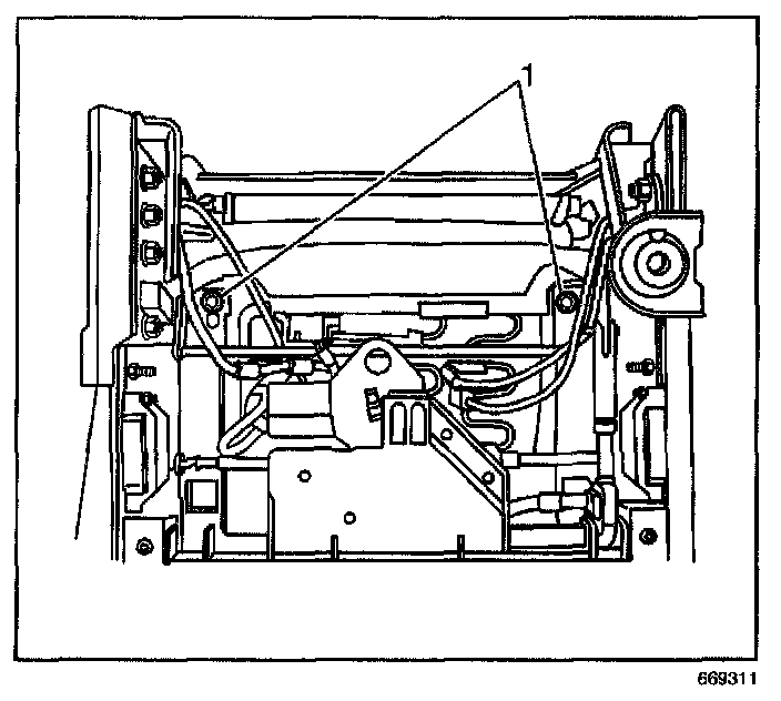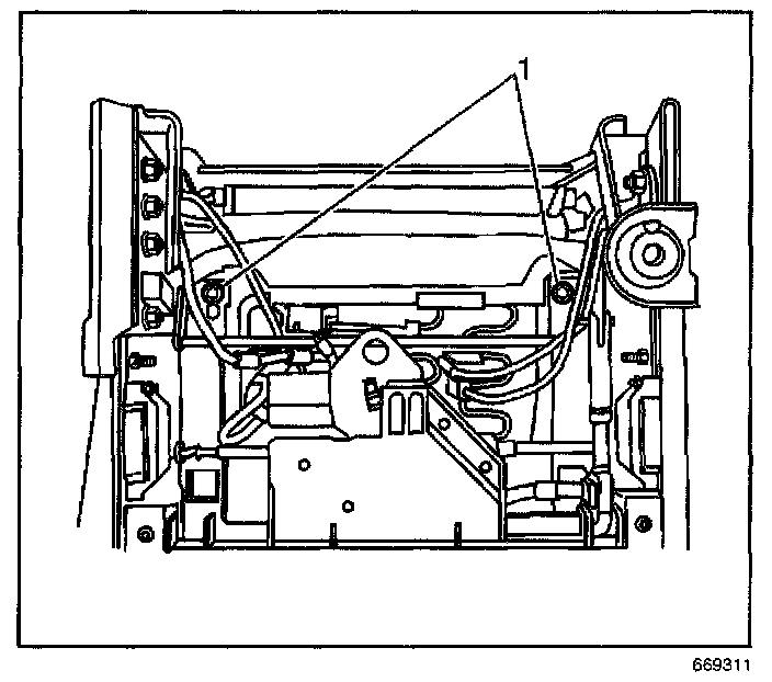 8. Adjust the front seat assembly up and forward in order to access the fasteners (1) at the rear of the front seat cushion assembly