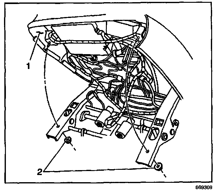 2. Adjust the front seat assembly up and forward in order to access the fasteners (1) at the rear of the front seat cushion assembly