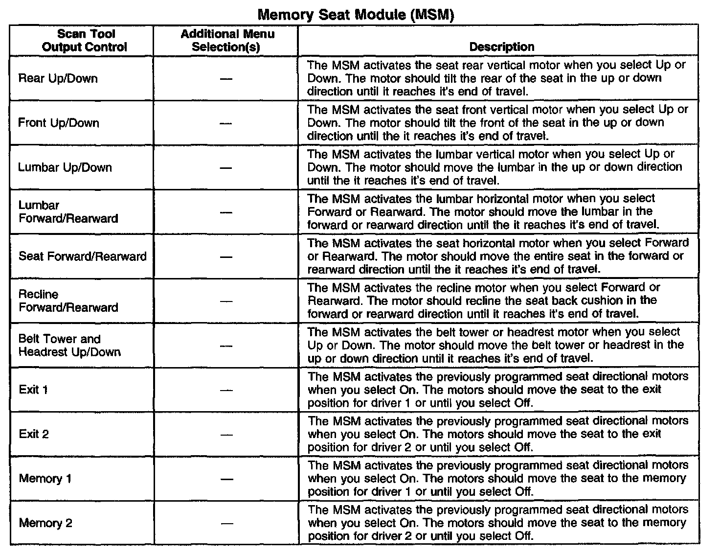 Scan Tool Output Controls - Memory Seat Module (MSM)
