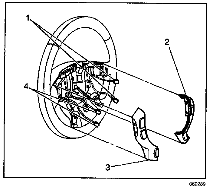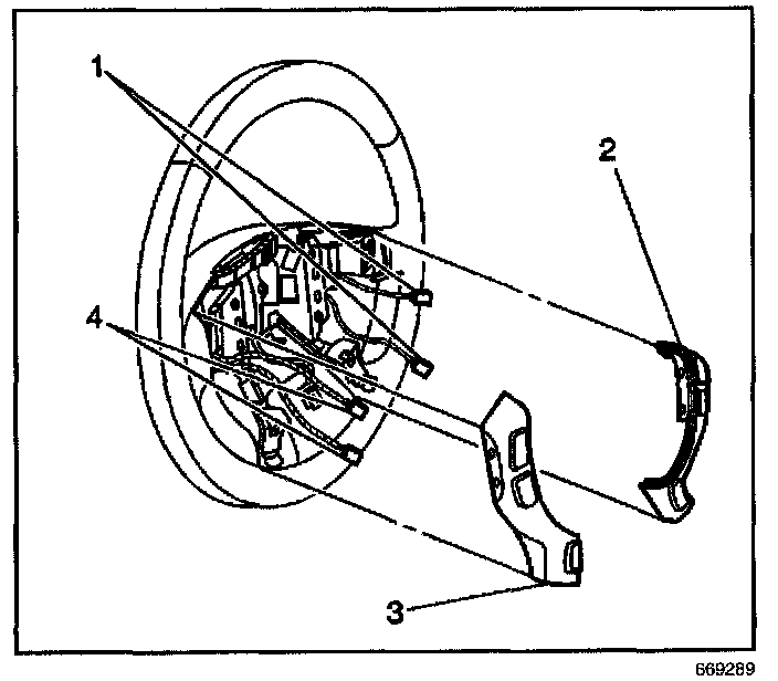 2. Align the steering control switch (2) engagement tabs to the steering wheel. Push in on the steering wheel control switch (2) in order to secure the control switch to the steering wheel.