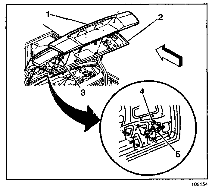 1. Route the backup lamp connector (5) and the grommet (3) through the rear compartment lid (2).