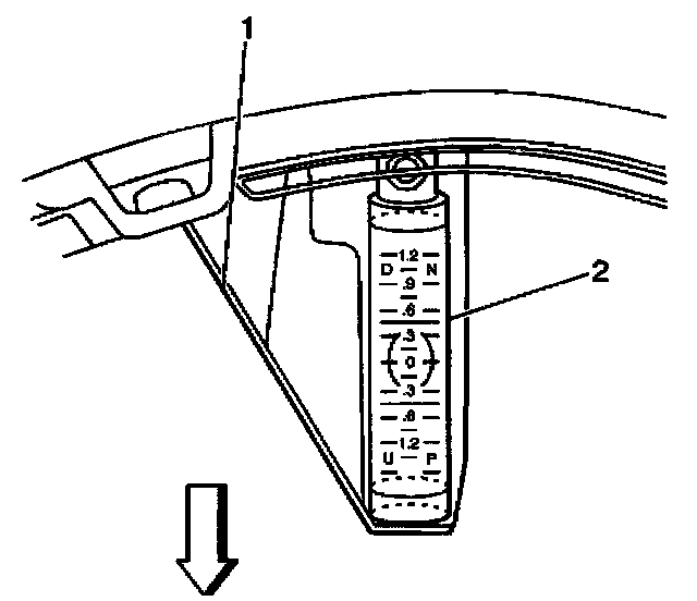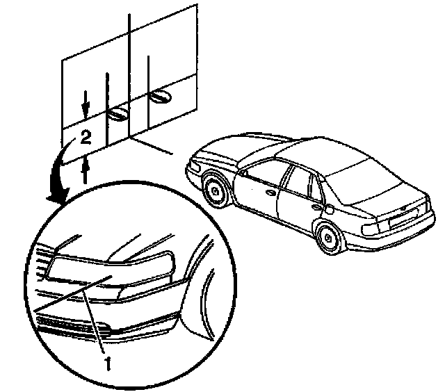 11. Measure the distance (2) from the floor to the headlamp aim dot. Transfer that measurement to the screen or wall (1). Repeat this for both headlamps.