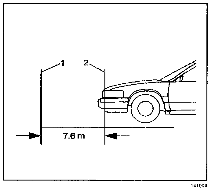 9. Position the vehicle so that the headlamp aim dots (1) are square with the screen or wall (2).