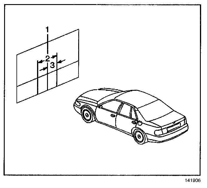 12. Locate the vertical centerline (1) on the screen or wall so that it is in line with the center of the vehicle. This can be accomplished by sighting through the center of the rear window and over the hood.