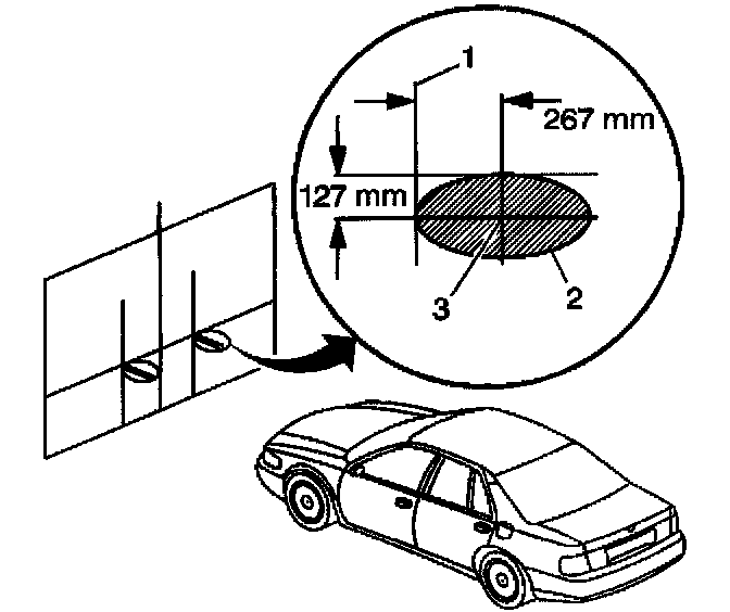 15. Measure 127 mm (5 in) down from the horizontal centerline of the headlamp. Transfer that measurement to the screen or wall. Repeat this for both headlamps. The point at which these measurements intersect should be the center (3) of the headlamp hot spot (2).