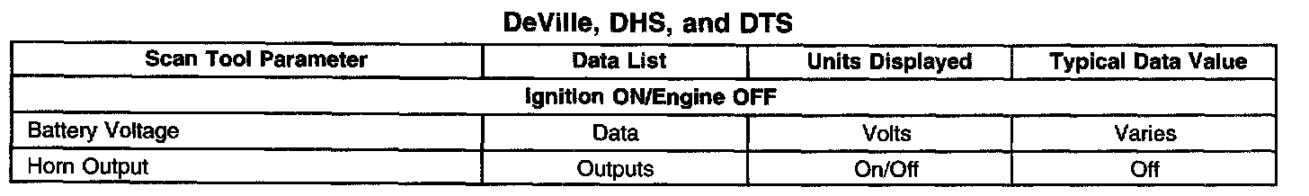 The Horns Scan Tool Data List contains all of the horns related parameters that are available on the scan tool. The parameters in the list are arranged in alphabetical order. The column, "Data List," indicates the location of the parameter within the scan tool menu selections. Use the Horns Scan Tool Data List as directed by a diagnostic table or in order to supplement the diagnostic procedures. Begin all of the diagnostic procedures with Diagnostic System Check - Horns.