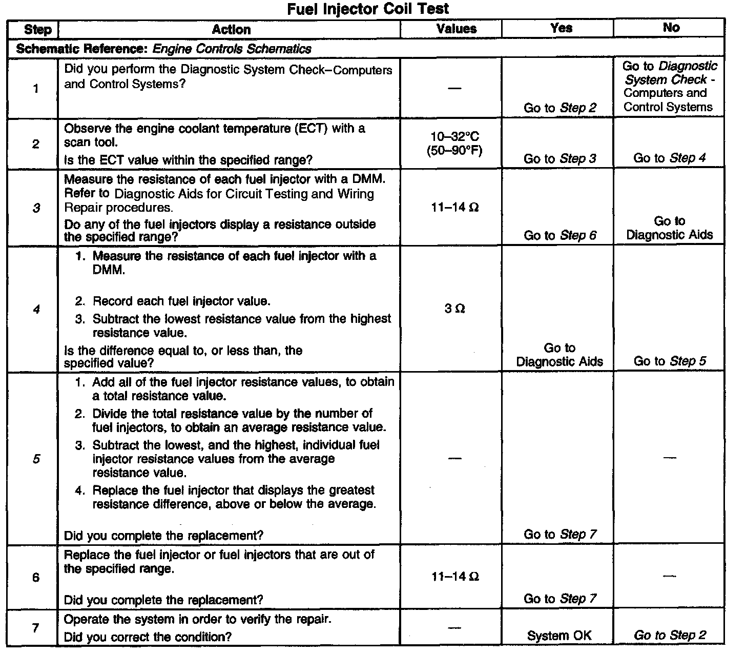 4. This step determines if all of the fuel injectors are within 3 ohms of each other. If the highest resistance value is within 3 ohms of the lowest resistance value, then all of the fuel injector coil windings are OK.