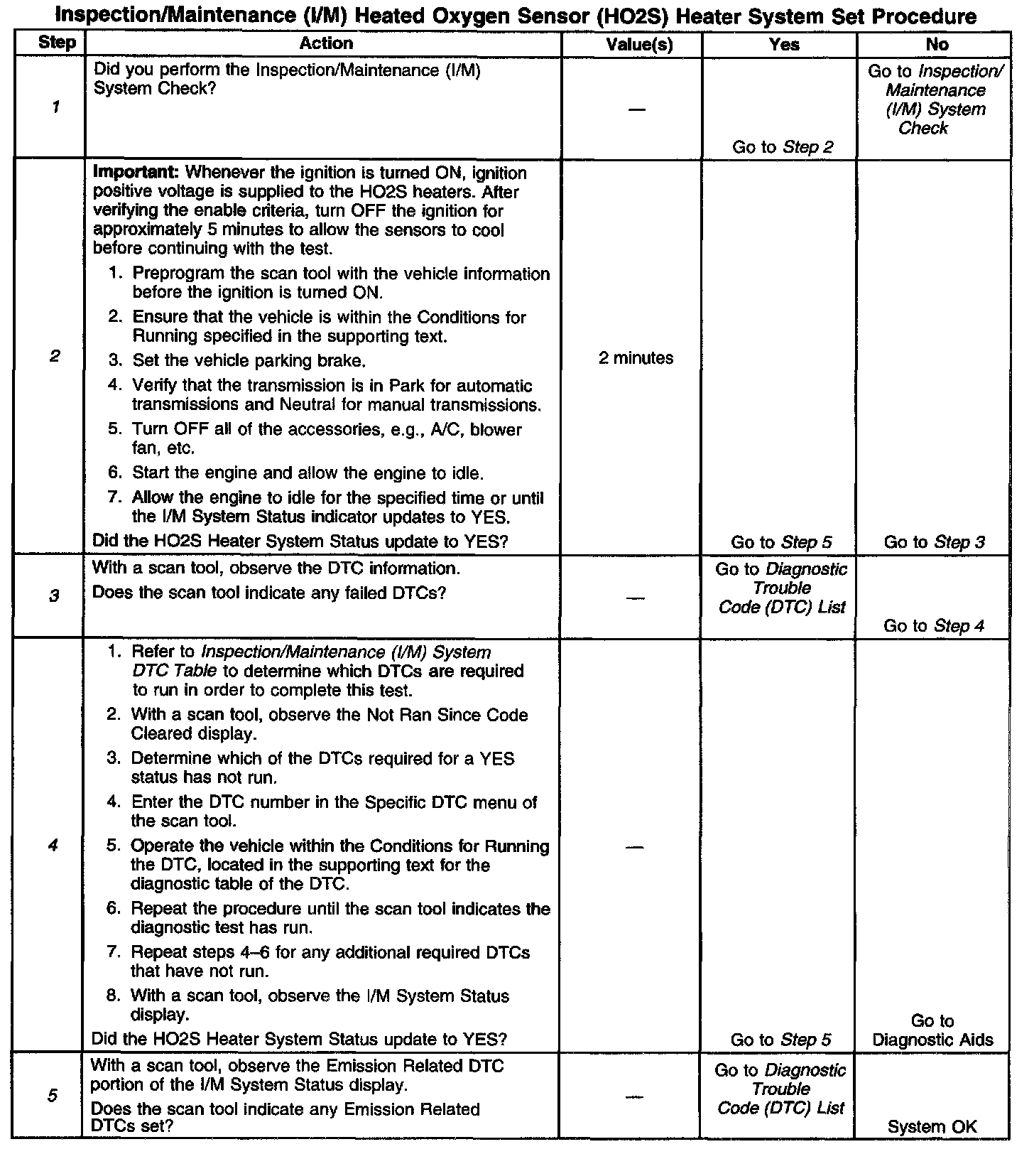 3. This step identifies a first failure of a type B DTC. A DTC only appears on the I/M System Status display when the DTC becomes a MIL illuminating DTC. This occurs on the second failure of a type B DTC. A first failure of a type B DTC will not allow the I/M System Status to update to YES. Refer to Diagnostic Aids.