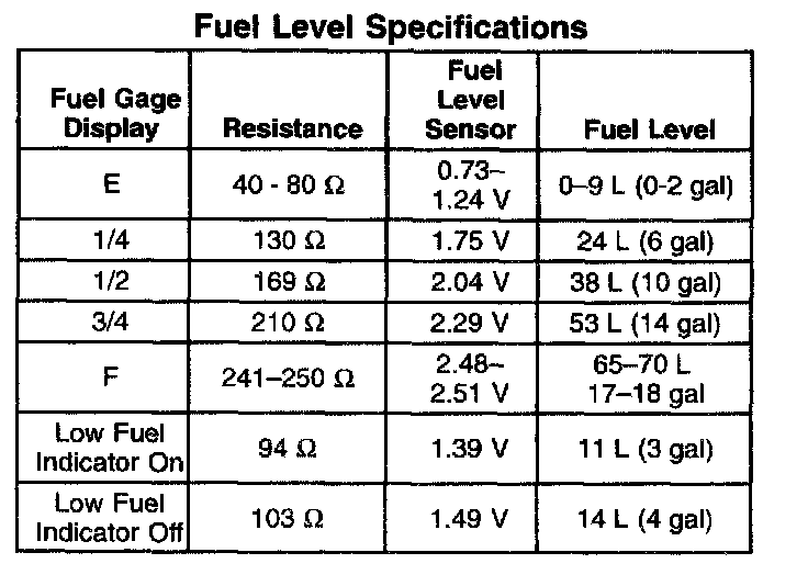 Fuel Level Specifications: