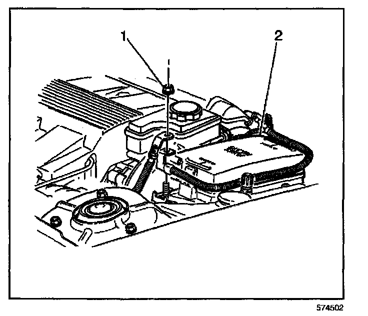 3. Connect the positive battery cable to the underhood fuse block (2).