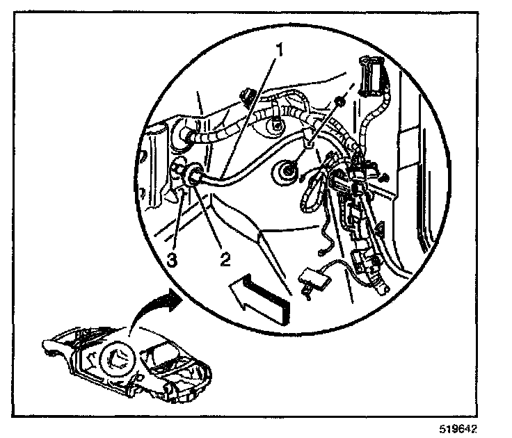 1. Slide the battery cable (1) through the opening in the cowl panel (3) and seat the cable grommet (2) by pulling the cable forward into the engine compartment.