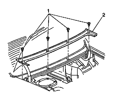 2. Remove the four fasteners (1) securing the rear window lower reveal molding (2) to the body.