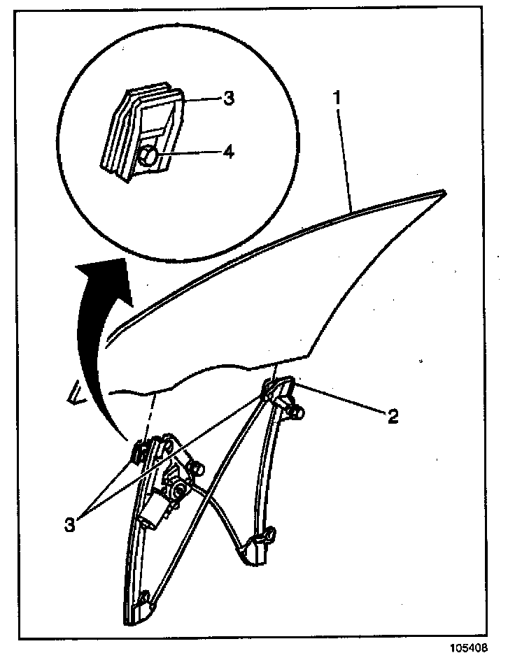 2. Carefully raise the window regulator clamps (2) to the full up position, engaging the window (1).
