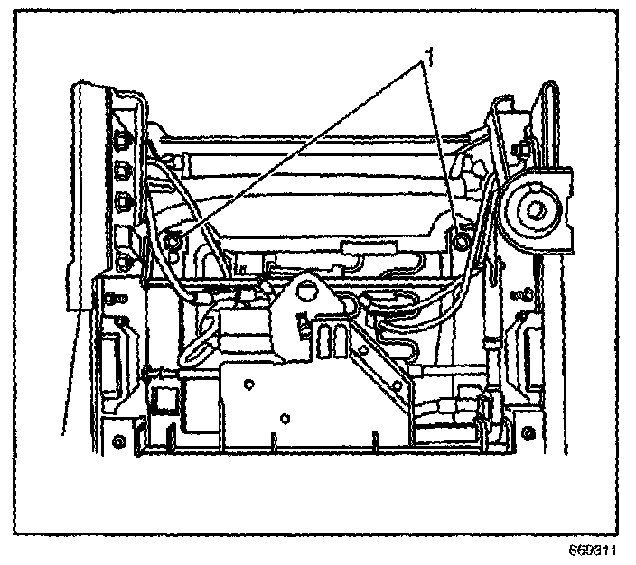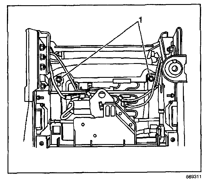 8. Adjust the front seat assembly up and forward in order to access the fasteners (1) at the rear of the front seat cushion assembly