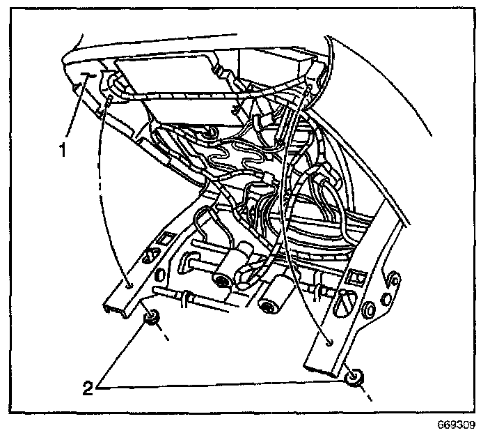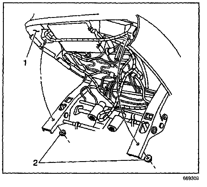 2. Adjust the front seat assembly up and forward in order to access the fasteners (1) at the rear of the front seat cushion assembly