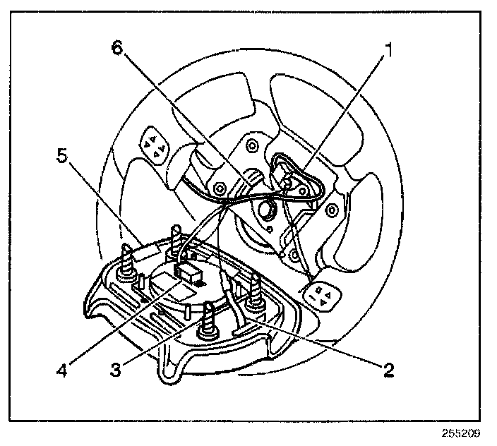 4. Push the driver inflator module (5) firmly to the steering wheel in order to engage the drivers inflator retainers.