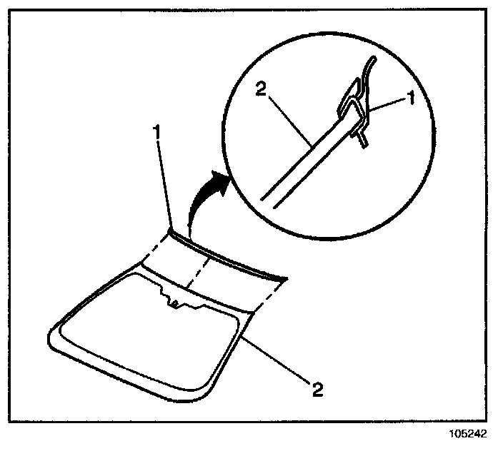 Remove the upper reveal molding (1) from the windshield (2) starting at the center and working outboard to both ends.