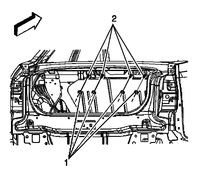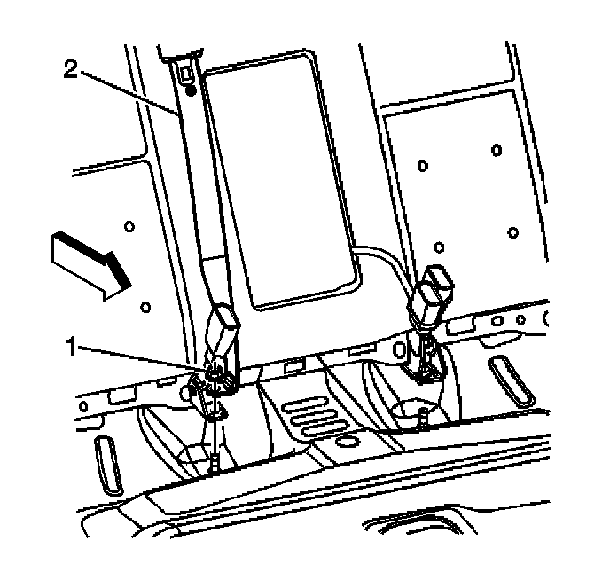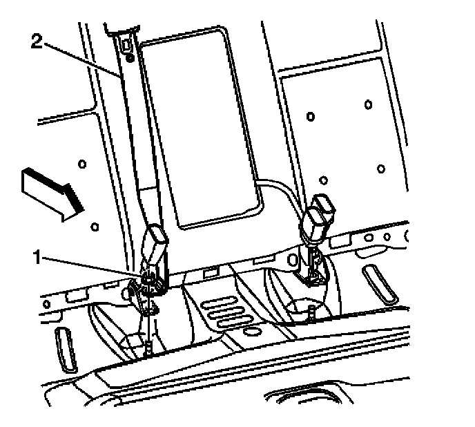 4. Remove the center seat belt (2) and shoulder belt buckle nut (1), if equipped.