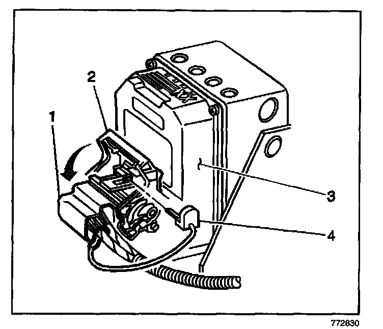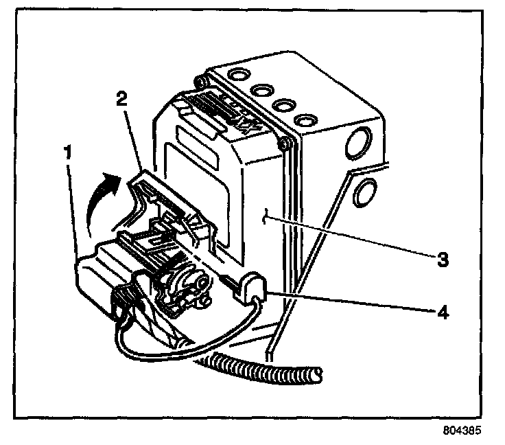 4. Remove the EBCM connector position assurance retainer (4) from the EBCM electrical connector (1).