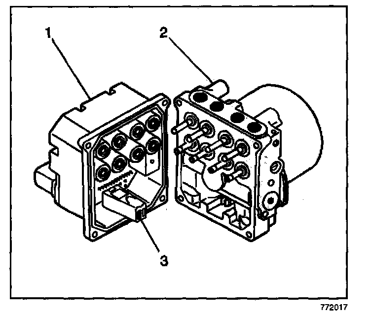 3. Make sure that the internal pump motor connector (3) is installed into the new EBCM (1) prior to EBCM replacement.