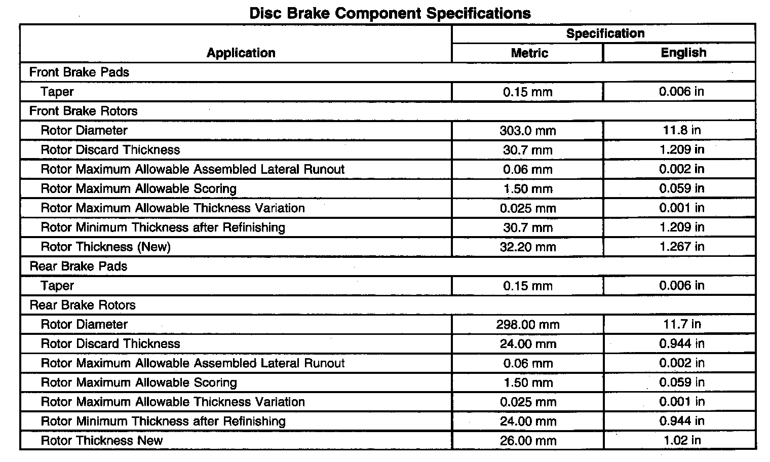 Disc Brake Component Specifications: