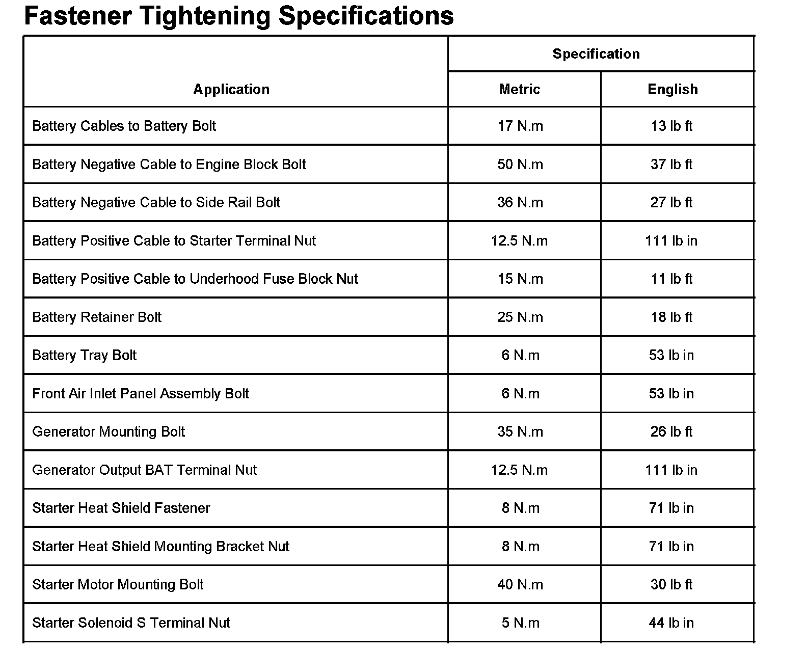 Fastener Tightening Specifications: