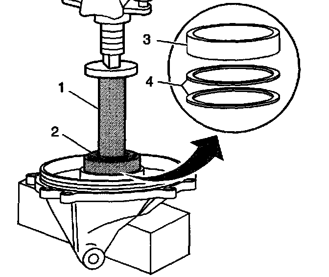 11. Using the J5590 (2), the J42170 (1) and a press, install the shim (4) and bearing race (3) into the differential side cover.