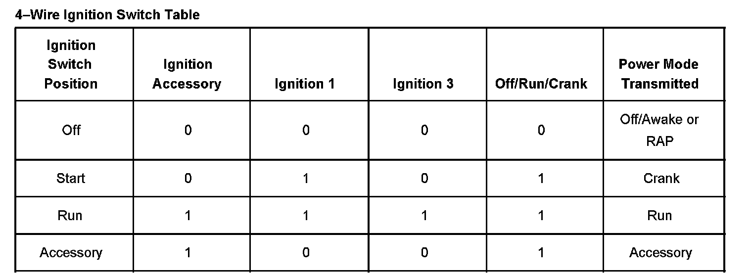4-Wire Ignition Switch Table: