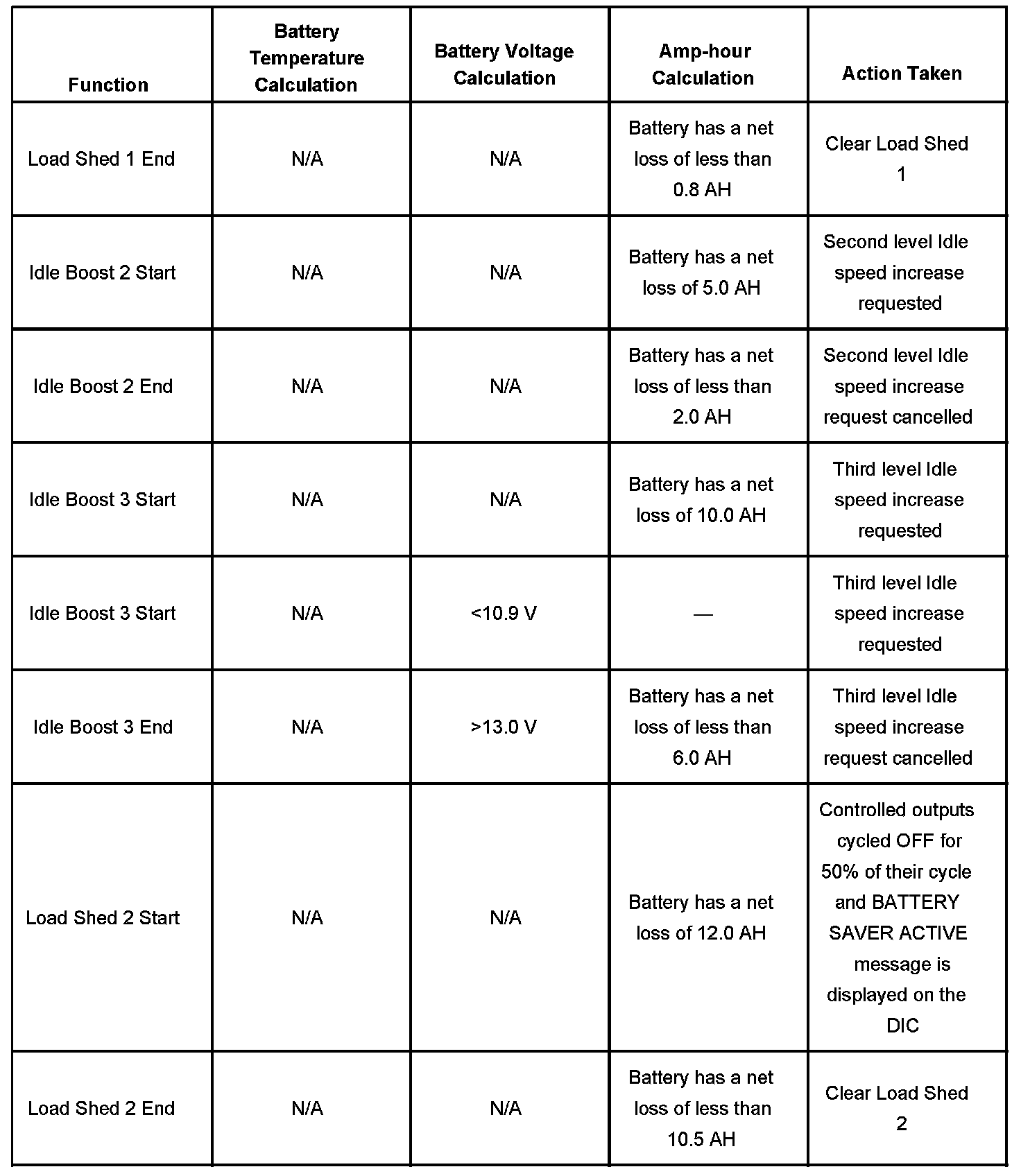 The PMM will either request an increase in the engine idle speed to the PCM or the PMM will cycle or turn off loads, called the load-shed function, in order to preserve the vehicle electrical system operation. The criteria used by the PMM to regulate this electrical load management are outlined below: