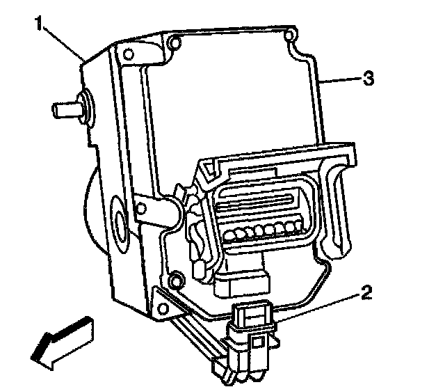 4. Connect the BPMV pump motor harness pigtail electrical connector (2) to the EBCM (3).